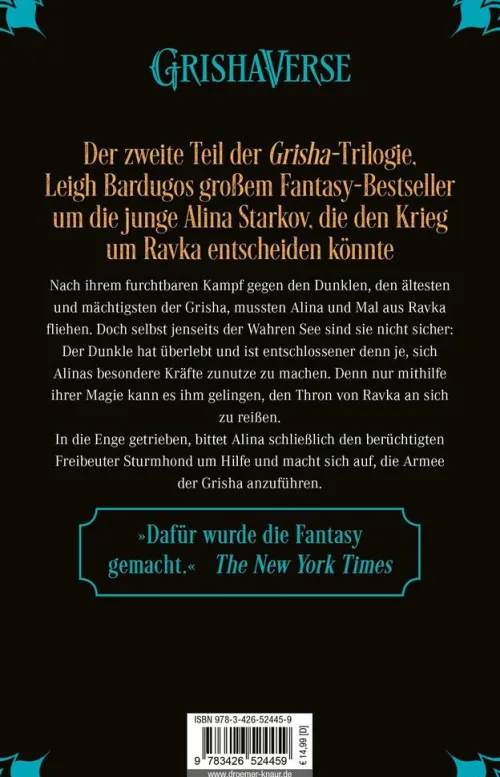 Nach ihrem furchtbaren Kampf gegen den Dunklen, den ältesten und mächtigsten der Grisha, mussten Alina und Mal aus Ravka fliehen. Doch selbst jenseits der Wahren See sind sie nicht sicher: Der Dunkle hat überlebt und ist entschlossener denn je, sich Alinas besondere Kräfte zunutze zu machen. Denn nur mithilfe ihrer Magie kann es ihm gelingen, den Thron von Ravka an sich zu reißen. In die Enge getrieben, bittet Alina schließlich den berüchtigten Freibeuter Stormhond um Hilfe und macht sich auf, die Armee der Grisha anzuführen.