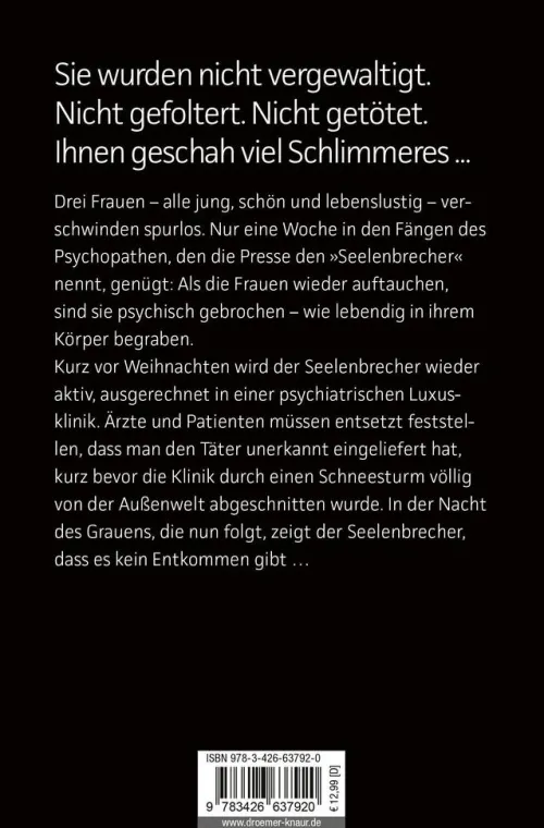 Drei Frauen – alle jung, schön und lebenslustig – verschwinden spurlos. Nur eine Woche in den Fängen des Psychopathen, den die Presse den »Seelenbrecher« nennt, genügt: Als die Frauen wieder auftauchen, sind sie psychisch gebrochen – wie lebendig in ihrem Körper begraben. Kurz vor Weihnachten wird der Seelenbrecher wieder aktiv, ausgerechnet in einer psychiatrischen Luxusklinik. Ärzte und Patienten müssen entsetzt feststellen, dass man den Täter unerkannt eingeliefert hat, kurz bevor die Klinik durch einen Schneesturm völlig von der Außenwelt abgeschnitten wurde. In der Nacht des Grauens, die nun folgt, zeigt der Seelenbrecher, dass es kein Entkommen gibt . . .
