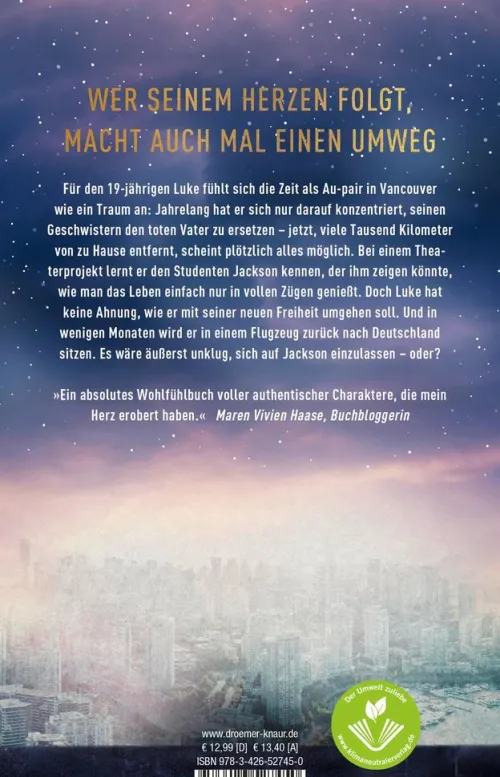 Für den 19-Jährigen Luke fühlt sich die Zeit als Au pair in Vancouver an wie ein Traum: Jahrelang hat er sich nur darauf konzentriert, seinen Geschwistern den toten Vater zu ersetzen – jetzt, viele tausend Kilometer von Zuhause entfernt, scheint plötzlich alles möglich. Bei einem Theaterprojekt findet Luke schnell neue Freunde und lernt auch den Studenten Jackson kennen, der ihm zeigen könnte, was es bedeutet, wirklich lebendig zu sein. Doch Luke hat keine Ahnung, wie er mit seiner neuen Freiheit umgehen soll. Und in wenigen Monaten wird er in einem Flugzeug zurück nach Deutschland sitzen. Es wäre äußerst unklug, sich auf Jackson einzulassen – oder?