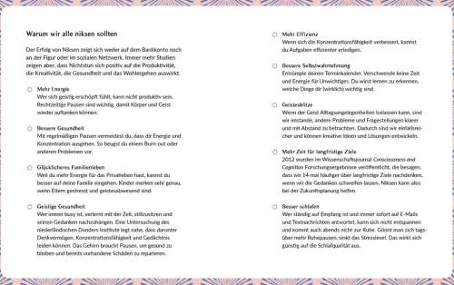 Beim Niksen geht es um die Freude an den kleinen Auszeitmomenten des Tages, um das bewusste Durchatmen und darum, dem Geist eine Pause zu gönnen. Dadurch können Sie einen Moment lang ganz bei sich selbst sein und bewusster Ihren Körper wahrnehmen. Mit den Ideen für tägliche Wohlfühlpausen und den dazugehörigen praktischen Anleitungen im Buch wird Niksen schnell zu Ihrem täglichen Muntermacher und Energiekick. Lernen Sie an den verschiedensten Orten zu niksen, vom eigenen Zuhause über den Arbeitsplatz und sogar online. Darüber hinaus zeigt Ihnen der Ratgeber, wie Sie ihr erlerntes Wissen easy in den Alltag integrieren und auch auf Dauer beibehalten können. Untermalt werden die sieben Kapitel durch stimmige Illustrationen. Dann kann es ja losgehen mit dem Niksen!