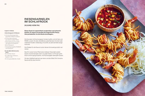 - Thai-Snacks: Hähnchen-Saté; Riesengarnelen im Schlafrock; Tintenfischringe mit knusprigem Knoblauch; Knusprige Teigtaschen mit Schweinehack; Maisbratlinge