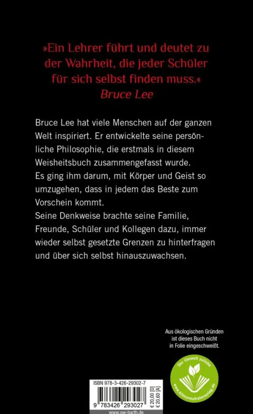 In diesem persönlichen Buch finden sich die Geheimnisse und Lebensweisheiten von Bruce Lee, die zu seinem unglaublichem Erfolg geführt haben als Schauspieler, Kampfkünstler und als Inspiration für die Welt. Dieser Erfolg basiert auf einer glasklaren geistigen Ausrichtung, die Bruce Lee ebenso trainierte wie seinen Körper. Bruce Lee verkörperte daoistische und buddhistische Prinzipien und setzte sie in seinen Kämpfen, aber auch in seinem alltäglichen Leben um. Sie ermöglichten ihm zu “ wissen“ , was ein Gegner als nächstes tun würde, bevor dieser überhaupt damit begonnen hatte.
