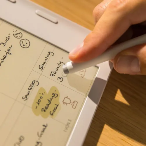 Erstellen Sie digitale Notizbücher für alles, was Sie festhalten möchten: Ideen, Tagebucheinträge, To-do-Listen, Zeichnungen u. v. m. Alle Ihre Notizen sind perfekt organisiert an einem Ort griffbereit. Ihren handschriftlichen Text können Sie ganz bequem in digitalen Text umwandeln lassen.
