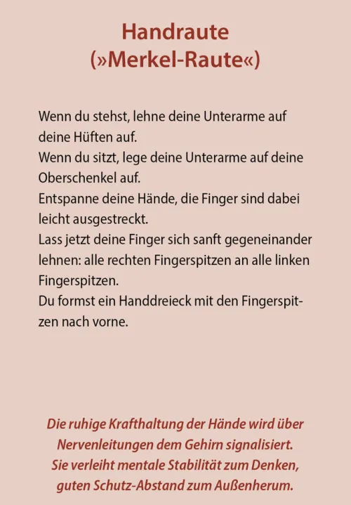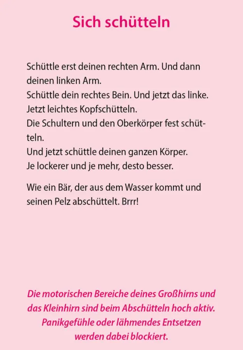 Dieses Kartenset enthält 50 der beliebtesten Übungen wie »Schulterwurf«, »Hand aufs Herz« und »Strohhalm-Atmen«, ergänzt durch 2 Zusatzkarten und ein Booklet mit weiterführenden Informationen. Ein Farbleitsystem sorgt für Orientierung, damit der Leser sofort die für ihn passende Lösung finden kann. Oder er zieht eine oder mehrere Karten nach dem Zufallsprinzip und findet so nützliche Soforthilfe. Die einzelnen Übungen sind nach Themen wie »Energie«, »Keine Panik« und »Ermutigung« sortiert.