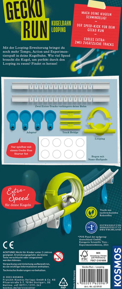Mit der Looping-Erweiterung geht s kopfüber weiter: Wie viel Speed braucht die Kugel, damit sie den Stunt meistert? Und in welchem Winkel startet sie am besten in den Looping? Erste Tipps gibt es in der Anleitung, aber nur wer selber tüftelt wird zum Meister! Mit jeder kleinen Veränderung starten die Kinder ab acht Jahren ein neues Kugel-Abenteuer! Das tolle Extra: Zusätzliche Bahn-Elemente vergrößern die Reichweite der KOSMOS Kugelbahn! Hinweis: nur mit dem Gecko Run Starter Set oder der „Big Box“ spielbar.