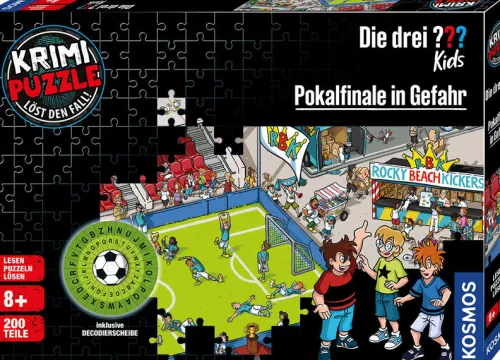 Ein interaktives Krimi-Puzzle: Kurzgeschichte lesen – Puzzle legen – Rätsel lösen! 200 Teile Puzzle für Kinder ab 8 JahreSpannendes Erlebnis rund um den Lieblingssport FußballZum Knobeln für alle Fans von Die drei ? ? ? KidsMit exklusiver Die drei ? ? ? Kids-Krimigeschichte und cooler DecodierscheibeAufregung in Rocky Beach! Während der Halbzeitpause beim großen Fußball-Finale passieren merkwürdige Dinge und die drei ? ? ? Kids erhalten geheimnisvolle Botschaften, die sie schnell entschlüsseln müssen. Wer steckt dahinter? Und steht sogar der Pokal auf dem Spiel? Das Krimi-Puzzle bringt junge Detektivinnen und Detektive ab acht Jahren mitten ins Stadion. Gemeinsam mit Justus, Peter und Bob lesen sie eine spannende Kurzgeschichte, legen das 200-teilige Puzzle und entdecken dabei den geheimnisvollen Tatort. Mit der beiliegenden Decodierscheibe gilt es, verschlüsselte Nachrichten zu entschlüsseln und den Fall zu knacken. Eine fesselnde Mischung aus Puzzeln, Lesen und Rätseln – perfekt für Fans von Die drei ? ? ? Kids!