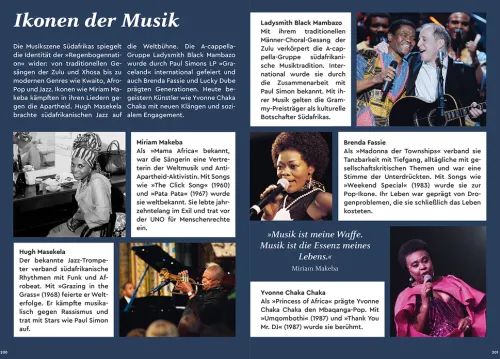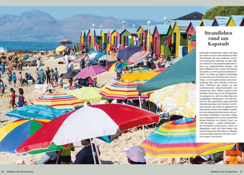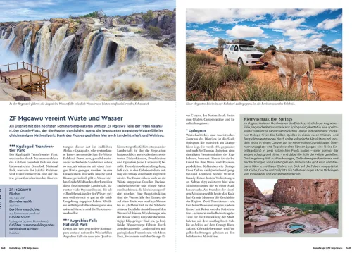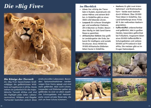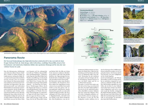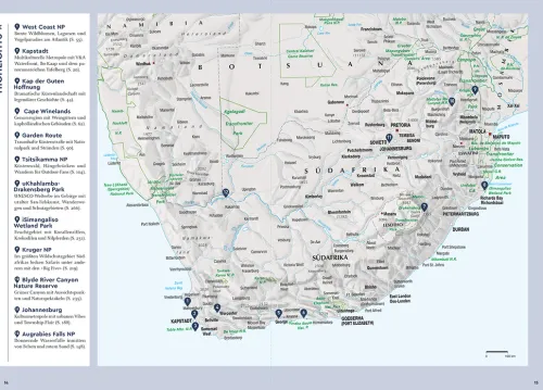 Themenseiten erzählen von berühmten Persönlichkeiten Südafrikas wie Nelson Mandela und Nadine Gordimer, bieten Wissenswertes zu den Big Five und weiteren heimischen Tieren, und berichten von den Traditionen verschiedener Ethnien. Mit fünf Routenvorschlägen – darunter zwei Trekkingtouren -, Stadtplänen und einem detaillierten Reiseatlas lässt sich die Reisevorbereitung erleichtern.