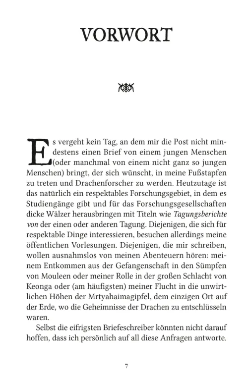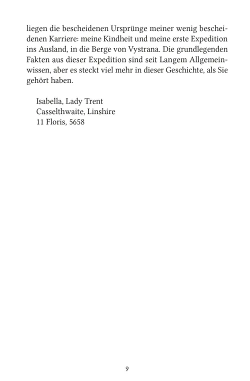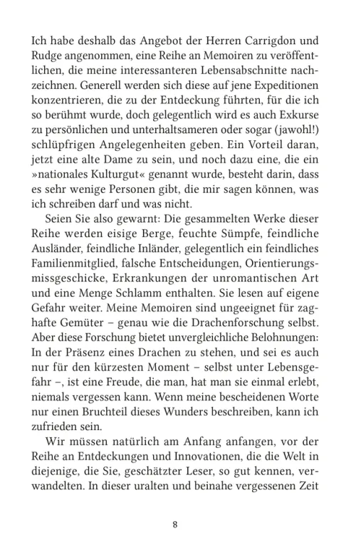 Lady Trent ist die herausragendste und erfolgreichste Drachenforscherin der Welt. Einst war sie ein junges Mädchen, vernarrt in Bücher und lernbegierig, das den erstickenden Konventionen ihrer Zeit trotzte und ihren guten Ruf, ihre Zukunft und ihre zarte Haut aufs Spiel setzte, um ihre wissenschaftliche Neugier zu befriedigen. Nun endlich liegt die wahre Geschichte dieser beispiellosen Pionierin vor. In ihren eigenen Worten berichtet Lady Trent über ihre aufregende Expedition in die Berge von Vystrana, wo sie die erste von vielen historischen Entdeckungen machte, die sie und die Welt für immer verändern sollten.