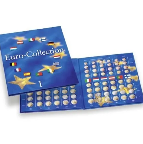 Sammelalbum aus hochwertig bedrucktem stabilen Karton mit vorgestanzten Einlagen zum Eindrücken der Euro-Kursmünzensätze der 12 Euroländer.