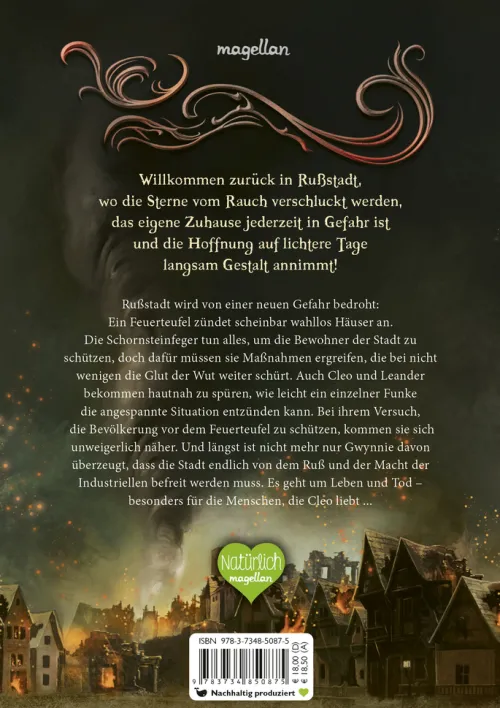 Rußstadt wird von einer neuen Gefahr bedroht: Ein unbekannter Feuerteufel zündet scheinbar wahllos Häuser an. Die Schornsteinfeger tun alles, um die Bewohner der Stadt zu schützen, doch dafür müssen sie Maßnahmen ergreifen, die bei nicht wenigen die Glut der Wut weiter schürt. Auch Cleo und Leander bekommen hautnah zu spüren, wie leicht ein einzelner Funke die angespannte Situation entzünden könnte. Bei ihrem Versuch, die Bevölkerung vor dem Feuerteufel zu schützen, kommen sie sich unweigerlich näher. Und längst ist nicht mehr nur Gwynnie davon überzeugt, dass die Stadt endlich von dem Ruß und der Macht der Industriellen befreit werden muss. Es geht um Leben und Tod besonders für die Menschen, die Cleo liebt . . .