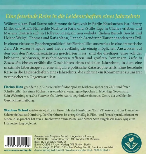 1933 enden die »Goldenen Zwanziger« mit einer Vollbremsung. In einem virtuosen Epochengemälde führt Florian Illies uns zurück in ein Jahrzehnt berstender politischer und kultureller Spannungen. Eine mitreißend erzählte Reise in die Vergangenheit, die sich wie ein Kommentar zu unserer verunsicherten Gegenwart liest: Liebe in den Zeiten des Hasses.