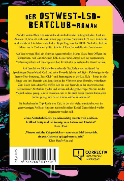 Der deutsche Publizist, Autor und Zeitzeuge Cordt Schnibben legt mit dem OstWest-LSD-BeatClub-Roman eine meisterhafte Darstellung der frühen Siebziger vor. Auf den ersten Blick eine verzwickte deutsch-deutsche Liebesgeschichte: Carl aus Bremen, 18 Jahre alt, zieht aus Protest gegen seinen Nazi-Vater 1972 nach Ost-Berlin und verliebt sich in Mara – doch der Hippie fliegt aus der DDR. Nach dem Fall der Mauer sucht Carl seine große Liebe im Chaos des zerfallenden Sozialismus. Auf den zweiten Blick ein skurriler Agententhriller: Maras Vater, Stasi-Offizier im Westeinsatz, hält Carl für einen LSD-Dealer und Spitzel, den der westdeutsche Verfassungsschutz auf ihn angesetzt hat. Er ließ ihn damals in den Knast werfen. Auf den dritten Blick die berauschende Geschichte vom Aufstand im Spießbürger-Deutschland: Carl und seine Freunde Sylwia und Sigi – Kabelträger in der Bremer Kult-Sendung „Beat-Club“ und Stammgäste in der Lila Eule – hören in den Songs von Jimi Hendrix und Janis Joplin das Vibrieren einer liberalen, weltoffenen Zeit. Nach dem Mauerfall treffen sich die drei Freunde in der anarchistischen Technoszene Ost-Berlins wieder und stellen sich die große Frage: Warum ist der Mensch schlau genug, um zu erkennen, wie er die Welt besser machen kann, aber dumm genug, um daran immer wieder zu scheitern? Ein hochaktueller Trip durch eine Zeit, in der sich vieles entwickelte, was im gegenwärtigen Rollback hin zum nationalistischen Dödel-Deutschland wieder abgeräumt werden soll.