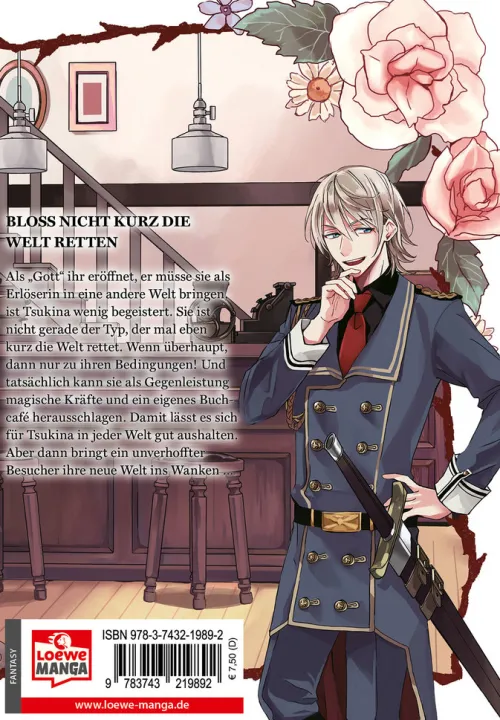 Als „Gott“ ihr eröffnet, er müsse sie als Erlöserin in eine andere Welt bringen, ist Tsukina wenig begeistert. Sie ist nicht gerade der Typ, der mal eben kurz die Welt rettet. Wenn überhaupt, dann nur zu ihren Bedingungen! Und tatsächlich kann sie als Gegenleistung magische Kräfte und ein eigenes Buchcafé herausschlagen. Damit lässt es sich für Tsukina in jeder Welt gut aushalten. Aber dann bringt ein unverhoffter Besucher ihre neue Welt ins Wanken . . .