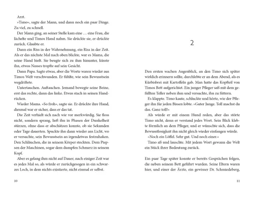 Eine Sorge, die unbegründet ist, denn Timos Sprachzentrum ist schwer beeinträchtigt, seine Feinmotorik erlaubt ihm noch nicht niederzuschreiben, was er erlebt. Und allmählich entdeckt er an sich selbst Fähigkeiten, die neu sind. Er kann Dinge, die er nicht können dürfte. Weiß von Sachen, die er nicht wissen sollte . . .