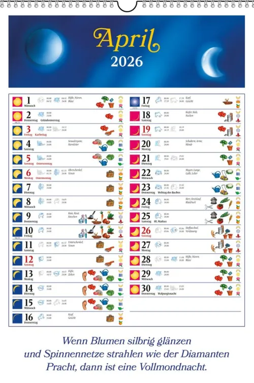 Sie möchten Ihr Leben optimieren, indem Sie bewusster auf die Rhythmen der Natur achten? Dieser attraktive, großformatige Wandkalender ist seit einem guten Vierteljahrhundert geradezu der Leuchtturm, wenn man den richtigen Weg sucht, die wichtigsten Mondeinflüsse zu verstehen. Er bietet auf seinen klar gestalteten Monatsseiten grundlegende Informationen zu den Mondphasen und Mondständen sowie Tipps für die Bereiche Gesundheit, Körperpflege, Garten, Landwirtschaft, Reisen, Geld und zwischenmenschliche Harmonie.