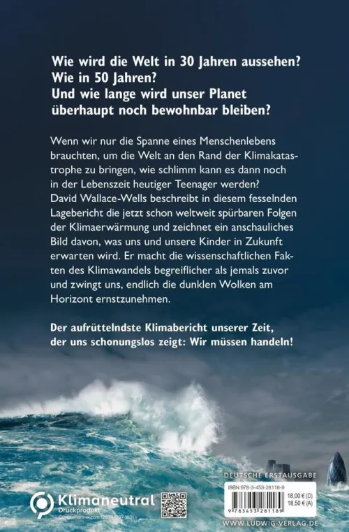 Die heute schon spürbaren und die schlimmstmöglichen Folgen der Klimaerwärmung sind das Thema des Journalisten David Wallace-Wells in diesem spektakulären Report. Wie kann und wird das Leben auf der Erde in nur 40, 50, 60 Jahren aussehen? Sicher ist: Heutige Teenager und Kinder werden noch erleben, wie sich die Bedingungen für die Menschheit auf der Erde dramatisch verschlechtern, sie werden erleben, wie sie in Teilen unbewohnbar wird. Wallace-Wells macht die vielen wissenschaftlichen Erkenntnisse, die die Mehrheit der Menschen oft gar nicht erreichen, begreifbar, ja fühlbar. Und am Ende steht die drängende Frage: Haben wir überhaupt noch eine Chance, das Unheil abzuwenden?