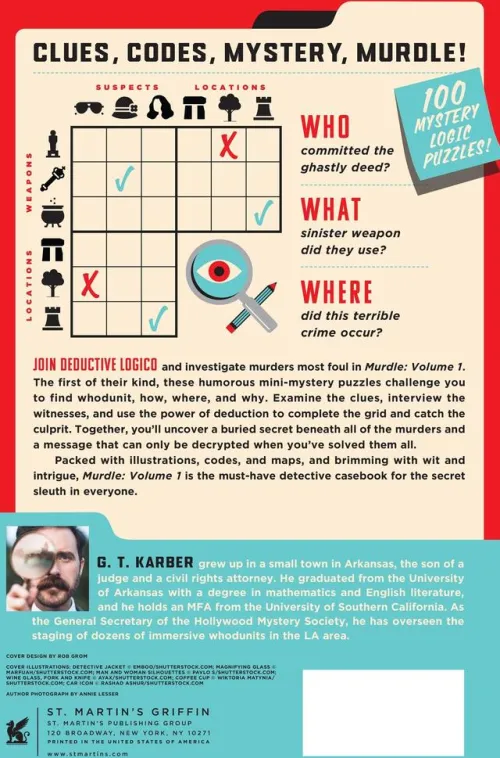 G. T. Karber, the creator of the popular online daily mystery game Murdle, presents the first collection of 100 original murder mystery logic puzzles-a perfect gift for armchair detectives and puzzlers to hone their minds and solve a series of crimes.