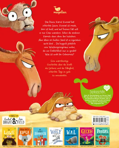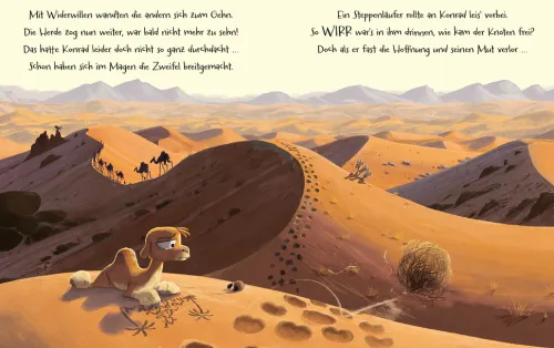 Als die Sonne über der Wüste aufgeht, erwacht das kleine Kamel Konrad und hat schlechte Laune. Ihm ist heiß, er ist müde, und auf keinen Fall will er zur Oase wandern. Sollen die anderen Kamele eben ohne ihn losziehen. Aber allein im heißen Sand ist es irgendwie auch blöd . . . Da hoppelt plötzlich eine Wüstenspringmaus vorbei, die vor Fröhlichkeit nur so sprüht! Was ist wohl ihr Geheimnis? Könnte auch Konrad nur ein Lächeln von guter Laune entfernt sein?
