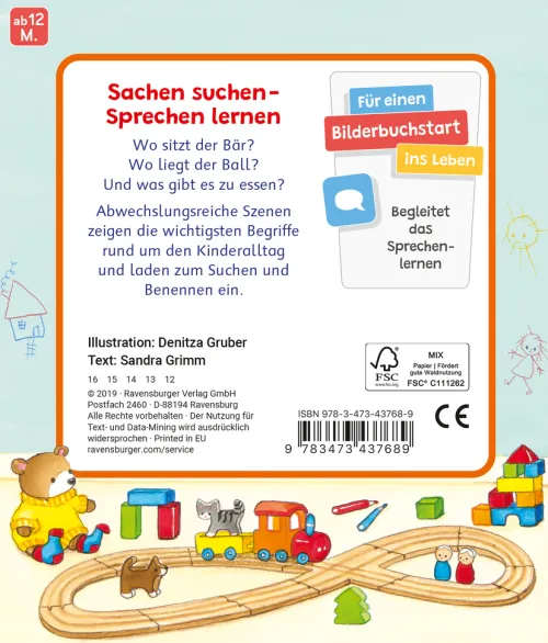 Die ersten gesprochenen Wörter sind etwas ganz Besonderes: der Ball, das Buch, die Katze. Abwechslungsreiche Szenen aus dem Kinderalltag und passende Suchvignetten laden zum Suchen und Benennen ein. So wird der Spracherwerb spielerisch unterstützt.