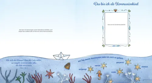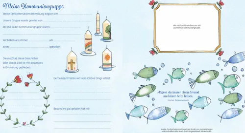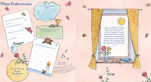 – Auf vielen illustrierten Seiten können Daten zum Kommunionkind, zur Kommunion, zur Familie (Eltern, Großeltern, Geschwister), der Kommuniongruppe, den Paten, dem Kommunionunterricht und vieles mehr eingetragen werden. Außerdem bleibt in dem Buch noch viel Platz zum Einkleben von Fotos und für gute Wünsche und Glückwünsche.