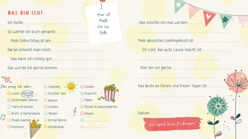 Dieses dekorative Freundschaftsbuch bietet eine tolle Möglichkeit, schöne Erinnerungen zu sammeln. Auf unterschiedlich gestalteten Doppelseiten können sich alle Freundinnen und Freunde, Klassenkameraden und Klassenkameradinnen, Bekannte und Verwandte verewigen: mit Wünschen und Plänen, liebsten Büchern, Liedern und vielem mehr. Es gibt Platz für Fotos und persönliche Grüße, inkl. Geburtstagsübersicht.