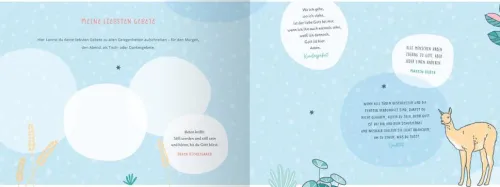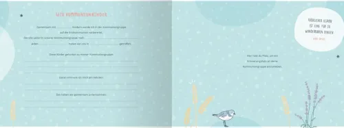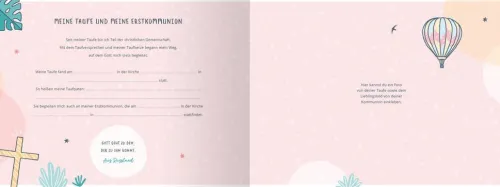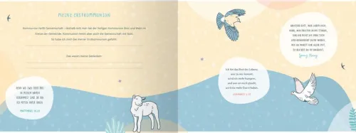 Das Kommunionkind hat in dem hochwertigen Buch die Möglichkeit, die Einladungskarte oder das Liedblatt des Gottesdienstes einzukleben, aber auch die Gäste, Eltern, Großeltern und Taufpaten finden Platz, um sich mit Wünschen zu verewigen. Segenswünsche, Bibelverse und Kindergebete begleiten den Weg hin zum Tag der Kommunion.