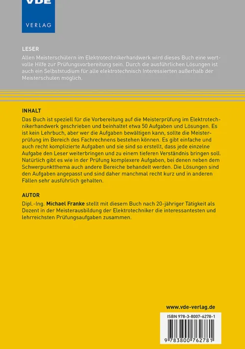 Das Buch ist speziell für die Vorbereitung auf die Meisterprüfung im Elektrotechnikerhandwerk geschrieben und beinhaltet etwa 50 Aufgaben und Lösungen. Es ist kein Lehrbuch, aber wer die Aufgaben bewältigen kann, sollte die Meisterprüfung im Bereich des Fachrechnens bestehen können. Es gibt einfache und auch recht komplizierte Aufgaben und sie sind so erstellt, dass jede einzelne Aufgabe den Leser weiterbringen und zu einem tieferen Verständnis bringen soll. Natürlich gibt es wie in der Prüfung komplexere Aufgaben, bei denen neben dem Schwerpunktthema auch andere Bereiche behandelt werden. Die Lösungen sind den Aufgaben angepasst und sind daher manchmal recht kurz und in anderen Fällen sehr ausführlich gehalten.