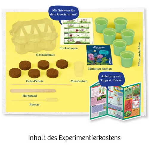 Huch! Eine Pflanze, die sich bei Berührung blitzschnell zusammenzieht! Die Mimose ist die ideale Pflanze, um mit den ersten botanischen Experimenten zu starten. Die leichte Aufzucht und die spannenden Reflexe der Blume bieten Kindern von 6 bis 10 Jahren eine Fülle an Versuchen mit Wind, Licht und Temperatur. Das mit lustigen Motiven gestaltbare Gewächshaus bietet Platz für sechs Mimosen-Töpfchen und passt perfekt auf jede Fensterbank. Ob die richtige Wasserversorgung oder Überwinterung – die Anleitung enthält viele Tipps für das optimale Züchten und Beobachten der Pflanze. Der KOSMOS Experimentierkasten Mimosen-Garten ist ein spannendes Mitbringsel und bietet Kindern erste Erfahrungen und Zucht-Erfolge im Bereich der Botanik. Huch! Eine Pflanze, die sich bei Berührung blitzschnell zusammenzieht! Was hinter dieser besonderen Reaktion der Mimose steckt, finden Kinder mit diesem kompletten Aufzuchtset heraus. Sobald die Mimosen-Samen in die Anzuchterde gegeben wurden, brauchen sie nur noch Licht und Wasser, und schon sind sie versorgt. Das Mini Gewächshaus passt auf jede Fensterbank und bietet ideale Bedingungen für das Pflegen und Beobachten der Keimlinge. Die anschauliche Anleitung beantwortet Fragen, die auch direkt an den Pflanzen getestet werden können: Was brauchen Mimosen, um zu wachsen? Warum reagieren sie so empfindlich auf Berührungen oder Temperaturen? Mit diesen und weiteren Versuchen ist das KOSMOS Experimentierset eine tolle Überraschung als kleines Geschenk oder Mitbringsel zum Kindergeburtstag.