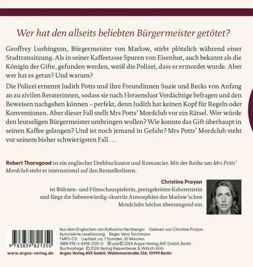Die Polizei ernennt Judith Potts und ihre Freundinnen Suzie und Becks von Anfang zu zivilen Beraterinnen, sodass sie nach Herzenslust Verdächtige befragen und den Beweisen nachgehen können – perfekt, denn Judith hat keinen Kopf für Regeln oder Konventionen. Aber dieser Fall stellt den Marlow Murder Club vor ein Rätsel. Wer würde den leutseligen Bürgermeister umbringen wollen? Wie konnte das Gift überhaupt in seinen Kaffee kommen? Und ist noch jemand in Gefahr?