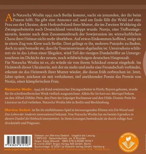 Als Natascha Wodin 1992 nach Berlin kommt, sucht sie jemanden, der ihr beim Putzen hilft. Sie stellt Nastja ein, die wie Wodins Eltern aus der Ukraine stammt. Die studierte Tiefbauingenieurin konnte nach dem Zusammenbruch der Sowjetunion im wirtschaftlichen Chaos ihrer Heimat nicht mehr überleben. Also stieg sie in einen Zug nach Berlin. Doch kaum ist ihr Visum dort abgelaufen, schlittert sie in das Leben einer Illegalen.
