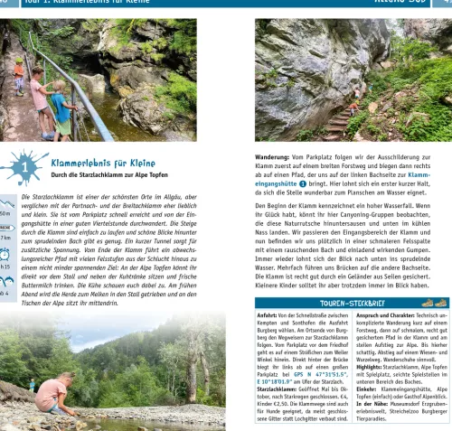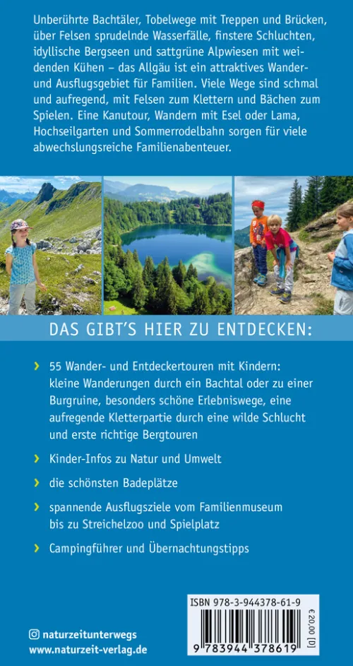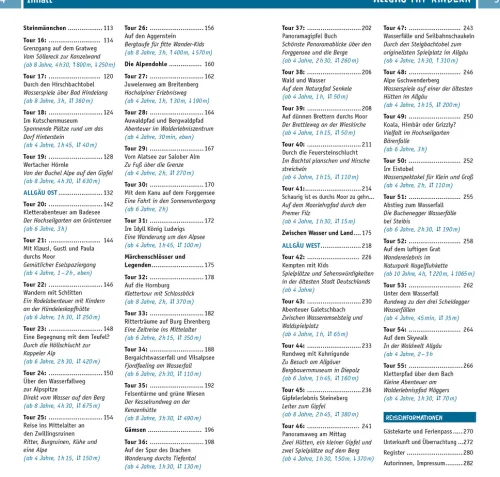 Unberührte Bachtäler, Tobelwege mit Treppen und Brücken, über Felsen sprudelnde Wasserfälle, finstere Schluchten, idyllische Bergseen und sattgrüne Alpwiesen mit weidenden Kühen – das Allgäu ist ein attraktives Wander- und Ausflugsgebiet für Familien. Viele Wege sind schmal und aufregend, mit Felsen zum Klettern und Bächen zum Spielen. Eine Kanutour, Wandern mit Esel oder Lama, Hochseilgarten und Sommerrodelbahn sorgen für viele abwechslungsreiche Familienabenteuer. Das gibt’s hier zu entdecken:55 Wander- und Entdeckertouren mit Kindern:kleine Wanderungen durch ein Bachtal oder zu einer Burgruine, besonders schöne Erlebniswege, Wandern mit Esel, eine aufregende Kletterpartie durch eine wilde Schlucht und erste richtige BergtourenKinder-Infos zu Natur und Umweltdie schönsten Badeplätze spannende Ausflugsziele vom Familienmuseum bis zu Streichelzoo und Spielplatz Campingführer und Übernachtungstipps