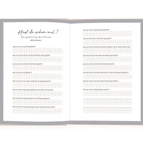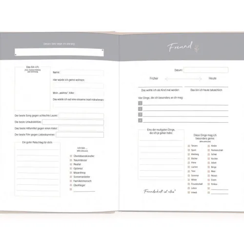 Erinnerst du dich noch, wie aufregend es für dich als Kind war, dein Freundebuch zurückzubekommen? Gespannt hast du die persönlichen Einträge deiner Freunde durchstöbert. Mit dem Freundschaftsbuch für Erwachsene lassen wir diesen Brauch wieder aufleben. Deine Freunde können sich darin auf eine kurzweilige und humorvolle Art verewigen. So entstehen garantiert lustige, aber auch spannende Einträge. Erfahre mehr über deine Liebsten und dich selbst. Das Buch kann auch als Gästebuch bei Geburtstagen oder anderen Anlässen genutzt werden. Das Ausfüllbuch ist zudem eine einzigartige Geschenkidee. So können sich alle Freunde eintragen und das Buch bereits ausgefüllt verschenken.