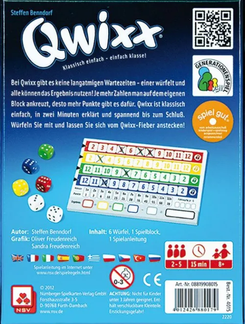 Bei Qwixx gibt es keine langatmigen Wartezeiten – einer würfelt undalle können das Ergebnis nutzen! Je mehr Zahlen man auf dem eigenenBlock ankreuzt, desto mehr Punkte gibt es dafür.