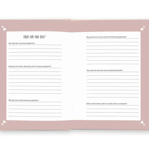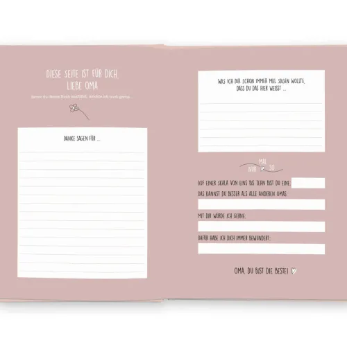 Dieses Buch bietet dir die Gelegenheit, deine Oma auf eine besondere Weise noch besser kennenzulernen. Jede Seite ist liebevoll gestaltet und den wichtigsten Stationen und Momenten im Leben deiner Oma gewidmet. Erfahre alles, was du schon immer über deine Oma wissen wolltest. Durch ausgewählte Fragen zu Kindheit, Familie, Liebe und vielem mehr entsteht ein einzigartiges Erinnerungsstück, das für immer bleibt. Mit Momentaufnahmen, Fotos oder Zeichnungen lässt sich dieses Buch noch persönlicher gestalten. Das Ausfüllbuch ist das perfekte Geschenk für deine Oma, egal ob zum Geburtstag, zu Weihnachten oder einfach nur so. Ein Geschenk, das allen Freude macht. Denn deine Oma wird sicher viel Spaß beim Ausfüllen haben und gerne ihr Wissen und ihre Erfahrungen mit dir teilen. So hat sie dann wiederum ein tolles Geschenk für dich, wenn sie das ausgefüllte Buch an dich zurückgibt.