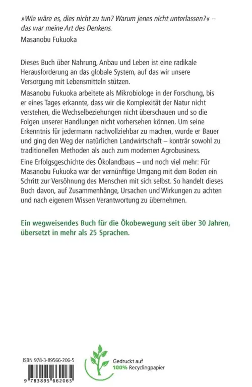 Das Buch vermittelt sowohl Einblicke in Fukuokas Weltsicht als auch in die Methoden seiner natürlichen Landwirtschaft. Unser Umgang mit Lebensmitteln, Ernährung und die Grenzen menschlichen Wissens sind weitere Themen.