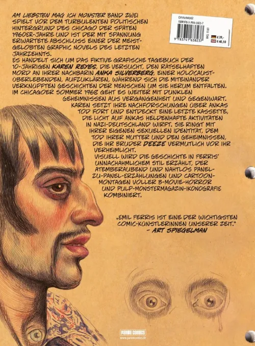 Ausgezeichnet mit dem „PENG! -Preis Comicfestival München“ 2025 als „Bester englischsprachiger Comic“ Am liebsten mag ich Monster Band Zwei spielt vor dem turbulenten politischen Hintergrund des Chicago der späten 1960ER-Jahre und ist der mit Spannung erwartete Abschluss einer der meistgelobten Graphic Novels des letzten Jahrzehnts. Es handelt sich um das fiktive grafische Tagebuch der 10-jährigen Karen Reyes, die versucht, den rätselhaften Mord an ihrer Nachbarin Anka Silverberg, einer Holocaust Überlebenden, aufzuklären, während sich die miteinander verknüpften Geschichten der Menschen um sie herum entfalten. Im Chicagoer Sommer 1968 geht es weiter mit dunklen Geheimnissen aus Vergangenheit und Gegenwart. Karen setzt ihre Nachforschungen über Ankas Tod fort und entdeckt eine letzte Kassette, die Licht auf Ankas heldenhafte Aktivitäten in Nazi-Deutschland wirft. Sie ringt mit ihrer eigenen sexuellen Identität, dem Tod ihrer Mutter und den Geheimnissen, die ihr Bruder DEEZE vermutlich vor ihr verheimlicht. Visuell wird die Geschichte in Ferris‘ unnachahmlichem Stil erzählt, der atemberaubend und nahtlos Panel-zu-Panel-Erzählungen und Cartoon- Montagen voller B-Movie-Horror und Pulp-Monstermagazin-Ikonografie kombiniert.“My Favorite Thing Is Monsters Book Two“ ist nominiert für den EISNER AWARD 2025 in den Kategorien- Best Graphic Album – New- Best Writer/Artist- Best Lettering Ausgezeichnet: PENG! -Preis Comicfestival München, 2025