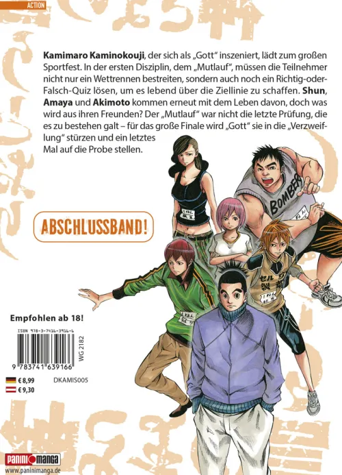 Unsere drei Freunde, Shun, Ichika und Amaya haben den ersten Wettkampf des mörderischen Sportturniers überlebt, das von Kamimaro Kaminokoji, dem Mann, der sich selbst als Gott bezeichnet, veranstaltet wird. Doch mit welchen Mitspielern und Gegnern werden sie es diesmal zu tun bekommen? Wer von ihnen wird es schaffen und als Sieger oder Siegerin hervorgehen? Während einer kurzen Verschnaufpause erlebt Shun zudem noch eine große Überraschung . . . Takumi und Okuhira wissen anscheinend mehr über Kamimaro und machen sich nun auf die Suche nach der Wahrheit!
