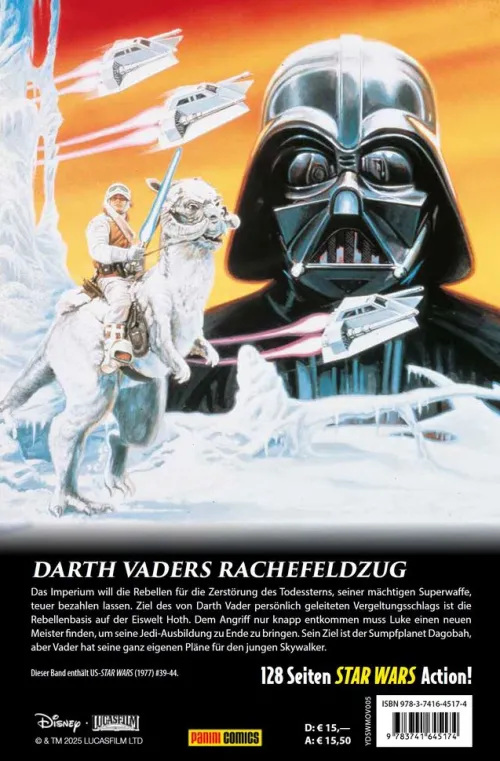 DARTH VADERS RACHEFELDZUG Das Imperium will die Rebellen für die Zerstörung des Todessterns, seiner mächtigen Superwaffe, teuer bezahlen lassen. Ziel des von Darth Vader persönlich geleiteten Vergeltungsschlags ist die Rebellenbasis auf der Eiswelt Hoth. Dem Angriff nur knapp entkommen muss Luke einen neuen Meister finden, um seine Jedi-Ausbildung zu Ende zu bringen. Sein Ziel ist der Sumpfplanet Dagobah, aber Vader hat seine ganz eigenen Pläne für den jungen Skywalker. Dieser Band enthält US-STAR WARS (1977) #39-44.