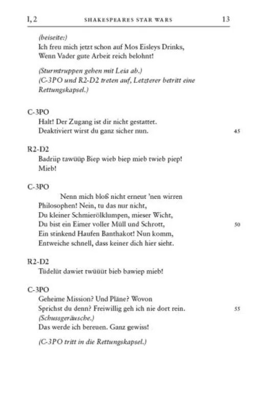 Der Barde aus Stratford begibt sich in eine weit, weit entfernte Galaxis. In Shakespeares Star Wars treffen zwei Welten aufeinander, die sonst nicht in einem Atemzug genannt werden. Aber warum eigentlich nicht? Immerhin haben die Figuren aus Star Wars viel mit den Dramatis Personae eines elisabethanischen Dramas gemein: Es gibt einen weisen (Jedi-)Ritter und einen bösen (Sith-) Lord, der eine schöne Prinzessin gefangen hält. Auch der jugendliche Held, der zur Rettung eilt, fehlt nicht. Hinzu kommen noch ein kampferprobter Draufgänger und dessen treuer Begleiter.