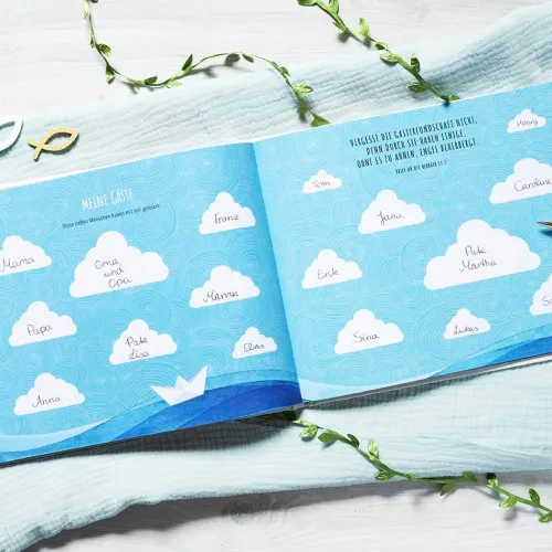Das liebevoll gestaltete Album bietet viel Platz, um die besonderen Erinnerungen an die Erstkommunion festzuhalten: Fotos, Einladungskarten, kirchliche Festtagsdokumente und andere Erinnerungsstücke können eingeklebt werden.