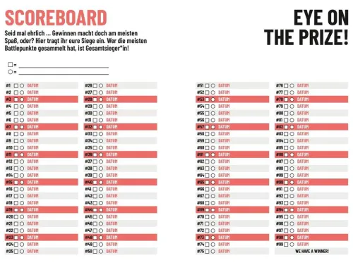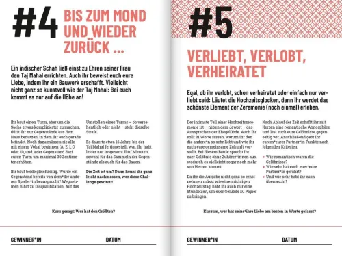 Alle Aufgaben sind ohne große Kosten und in der Nähe eures Zuhauses umsetzbar: Sammelt Punkte mit dem Bau eines verrückten Turms, einem Liebesgedicht oder dem Lieblingsessen eurer Partnerin oder eures Partners. Das Spiel für Paare ist ein wunderbares Geschenk zum Jahrestag, Valentinstag oder Hochzeitstag, denn es lässt euch intensiv Zeit miteinander verbringen und zusammen lachen.