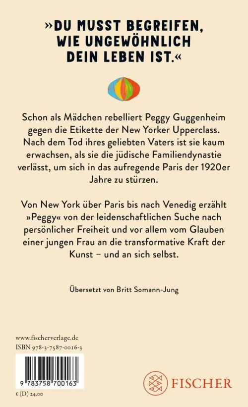 Schon als Mädchen rebelliert Peggy Guggenheim gegen die Etikette der New Yorker Upperclass. Nach dem Tod ihres geliebten Vaters ist sie kaum erwachsen, als sie die jüdische Familiendynastie verlässt, um sich in das aufregende Paris der 1920er Jahre zu stürzen: Pernod mit Djuna Barnes, Shootings mit Man Ray, Affären mit Samuel Beckett und Max Ernst. Ihre mondänen Partys schreiben Geschichte. Doch Peggy ist entschlossen, der Welt mehr zu hinterlassen.
