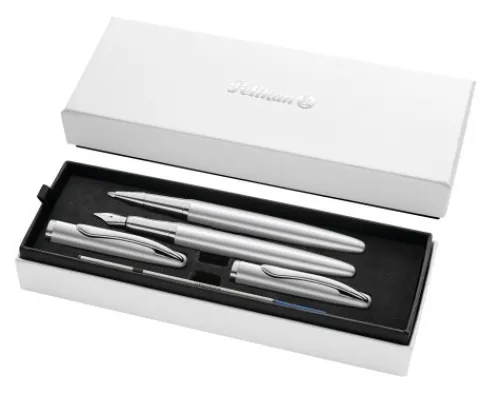 Perlmutt-schimmernd lackiertes Ober- und Unterteil; Clip, Ring und Spitze farblich veredelt; Robuster Clip durch federnd gelagerte Anbringung; Metall-Füllhalter mit Patronenfüllsystem; Polierte Edelstahlfeder in mittlerer Strichstärke; Ausgestattet mit einer Pelikan Großraum-Tintenpatrone; Blaue Füllhaltertinte; Metall-Roller; Ausgestattet mit wechselbarer Pelikan Großraum-Mine.