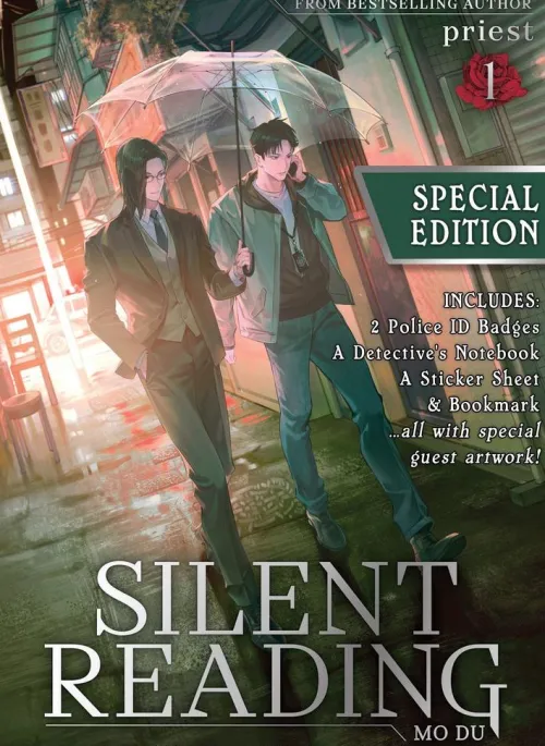 This limited Special Edition contains the Standard Edition, but with bonus merchandise shrinkwrapped to the book: a special police badge and detective’s notebook, a double-sided bookmark, and a sticker sheet. Don’t miss the new art from guest artists included in this special merch!