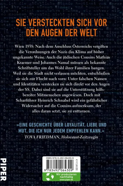 Wien 1938: Nach dem Anschluss Österreichs vergiften die Verordnungen der Nazis das Klima auf bisher ungekannte Weise. Auch die jüdischen Cousins Mathias Kraemer und Johannes Namal müssen als in der Öffentlichkeit stehende Schriftsteller um das Wohl ihrer Familien bangen. Weil sie die Stadt nicht verlassen möchten, entschließen sie sich zur Flucht nach vorn: Unter falschen Namen und Identitäten verstecken sie sich direkt vor den Augen der SS. Dabei sind sie auf die Unterstützung hilfsbereiter Mitmenschen angewiesen. Doch SS-Scharführer Schnabel ist ihnen bereits dicht auf den Fersen.