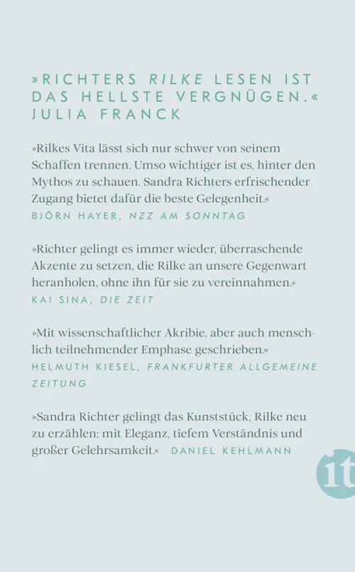 Sandra Richter, Literaturwissenschaftlerin und Direktorin des Deutschen Literaturarchivs Marbach, legt eine eindrucksvolle Biografie mit neuen Quellen aus dem Rilke-Archiv vor. Sie zeigt, warum es sich heute in besonderer Weise lohnt, Rilke wieder zu lesen: Er lebte in schwierigen Zeiten, und er verarbeitete sie mit einer Wucht, die vielleicht nur im Angesicht existenzieller Bedrohung glaubhaft wirkt.