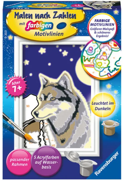 Dank der farbigen Motivlinien, können die Kinder das ganze Motiv Wolfsportrait und die Farben schneller erkennen.