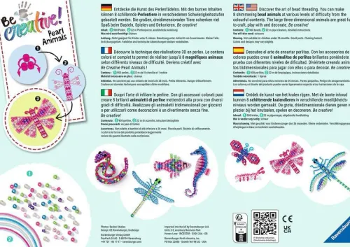 Mit dem Ravensburger BeCreative Set Perlentiere fädeln können Kinder ab 6 Jahren aus den im Kreativset enthaltenen Perlen und Pfeifenputzern Perlentiere basteln. Einfach die glänzenden Perlen auf die bunten Pfeifenputzer fädeln, zurechtbiegen und schon werden die schillernden Libelle, die bunten Schmetterlinge und 4 weitere Perlentiere zum Leben erweckt. Die großen, dreidimensionalen Tiere bringen Spaß beim Basteln, Spielen und Dekorieren!