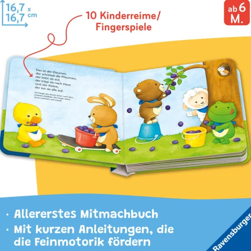 „Heile, heile Segen“, „Himpelchen und Pimpelchen“ oder „Das ist der Daumen“: 10 bekannte Kinderreime sorgen schon bei den Allerkleinsten für großen Spielspaß und lassen die Finger wackeln und zappeln. Zusätzlich bringen die farbenfrohen Bilder mit lustigen Tieren viel Freude beim Betrachten.