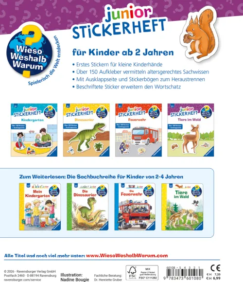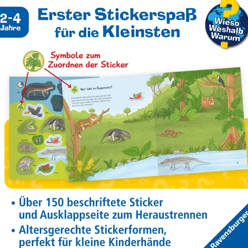 Mit dem Wieso? Weshalb? Warum? junior-Stickerheft entdecken schon Kinder ab 2 Jahren ihre Lieblingsthemen mit altersgerechten Stickern. Große, farbenfrohe Szenen laden zum kreativen Gestalten ein. Auf einfachen Puzzleseiten können die Kinder vorgegebene Flächen vervollständigen. Mit über 150 Stickern erkunden sie spielerisch die beliebtesten Sachthemen und lösen einfache Rätsel. Kurze Texte unterstützen dabei und vermitteln erstes Wissen.
